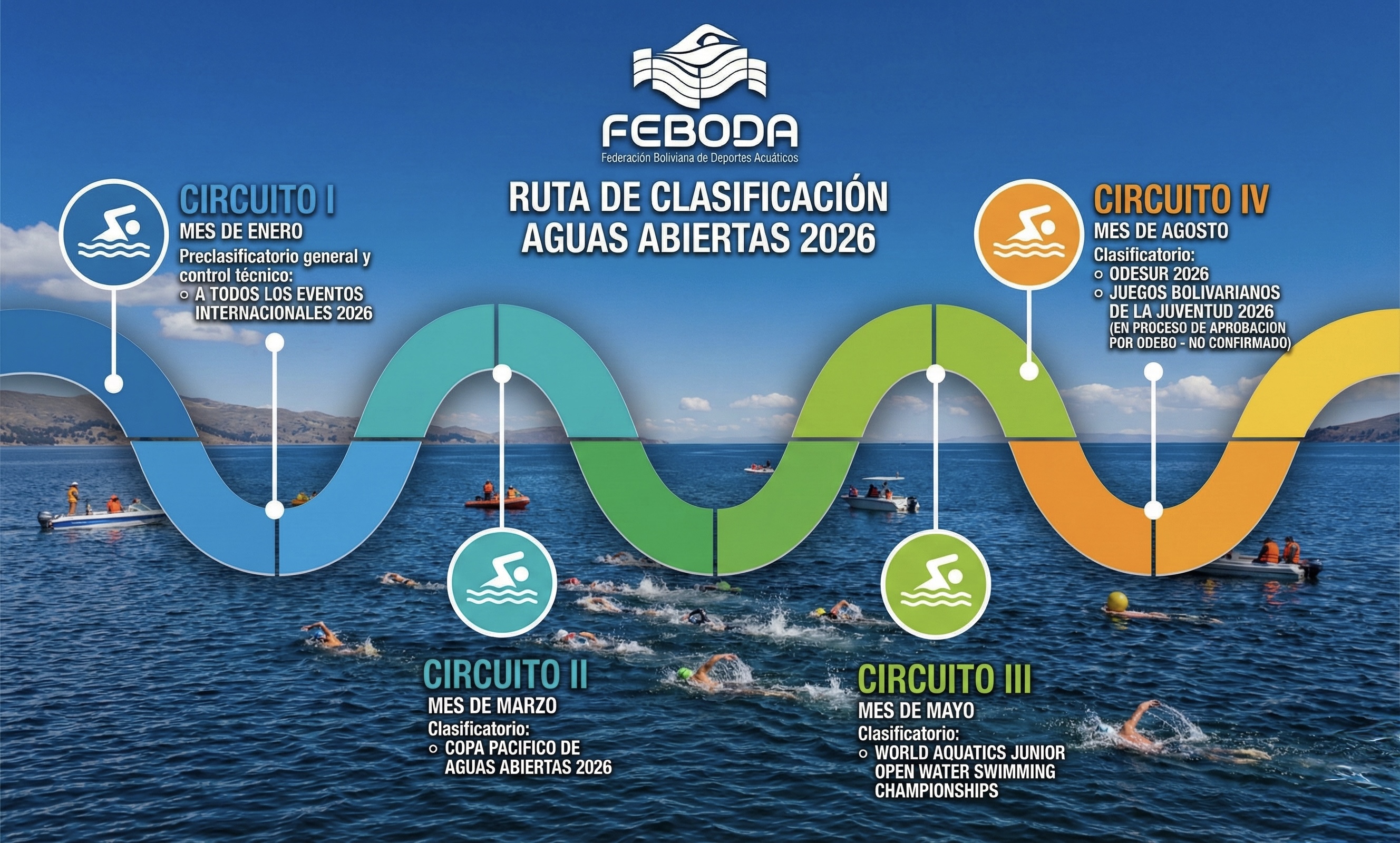 Sucre, 08 de enero de 2026. – La Federación Boliviana de Deportes Acuáticos (FEBODA) se complace en anunciar el calendario oficial y la normativa de clasificación para la disciplina de Aguas Abiertas correspondiente a la gestión 2026. Este cronograma estratégico tiene como objetivo conformar las selecciones nacionales que representarán al país en los eventos internacionales más importantes del ciclo.